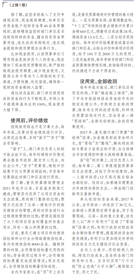 对此,业内人士认为,近些年,重庆在用钱问题上可谓科学精细,甚至有些“斤斤计较”,通过预算管理“闭环”,把公共财政资源配到关键地和紧要处,给百姓带来了越来越多的公共利益。