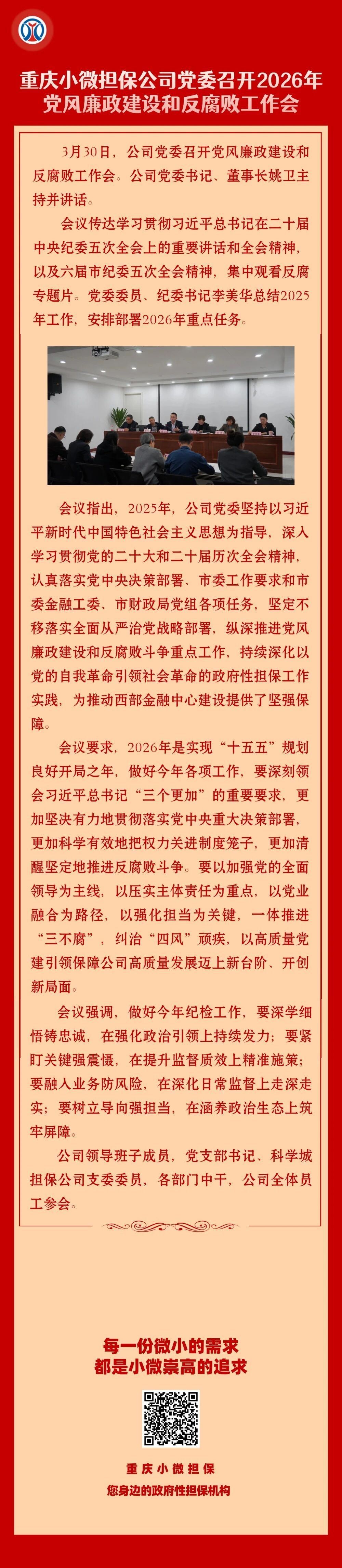 重庆小微担保公司:党委召开2026年党风廉政建设和反腐败工作会