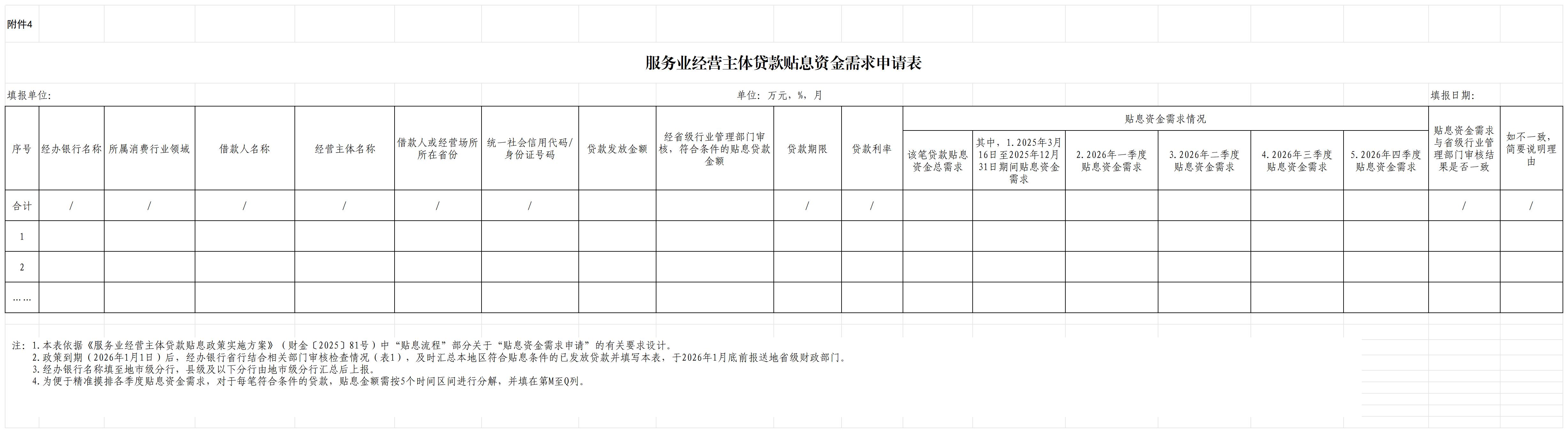 (一)贴息资金需求申请。政策到期后,经办银行市级分行结合行业管理部门审核检查情况,及时汇总本地区符合贴息条件的已发放贷款,于2026年1月底前向市财政局提出贴息资金需求申请(附件4)及收款账户表(附件5),并对申请材料的真实性、合规性、准确性负责。