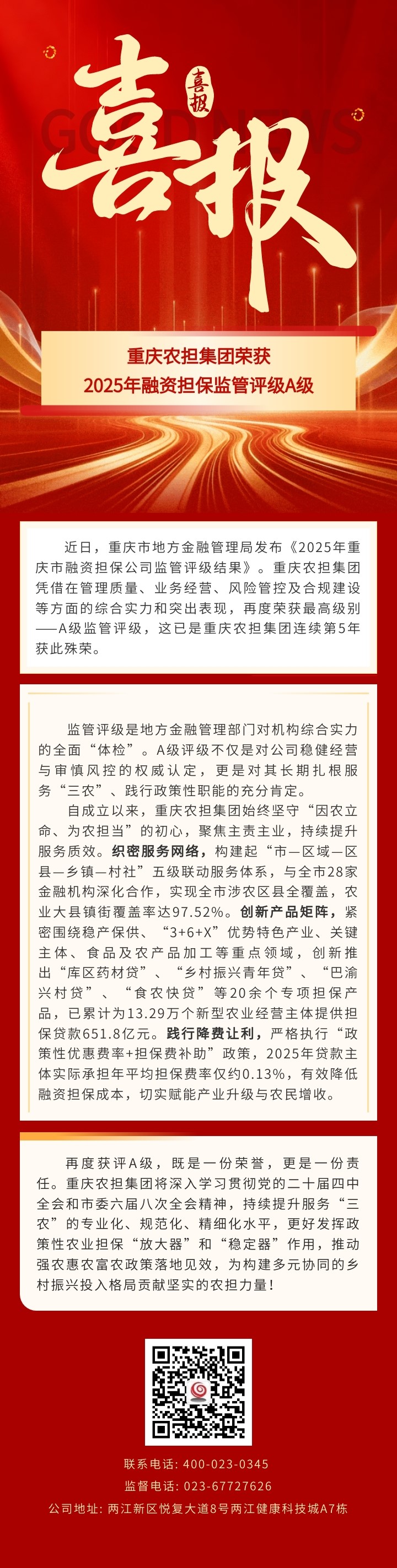 重庆农担集团:荣获2025年融资担保监管评级A级!